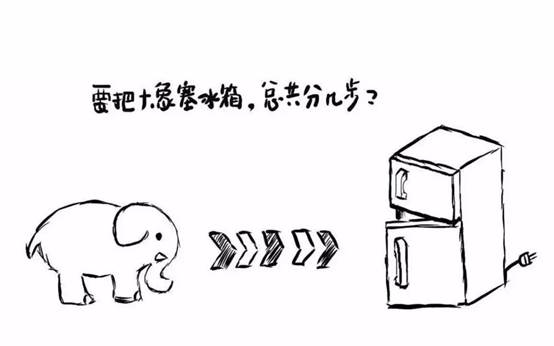 课程一开始,邱老师对在座的学员抛出了,“把一头大象放入冰箱要几个步骤?”让现场的学员进行思考。学员们一脸疑惑,纷纷表示需要三步:开门→将大象放入冰箱→关门。