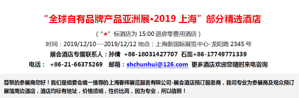 “全球自有品牌产品亚洲展·2019上海”组委会推荐上海春辉展览服务有限公司将为您提供酒店住宿预订等会务接待服务项目。